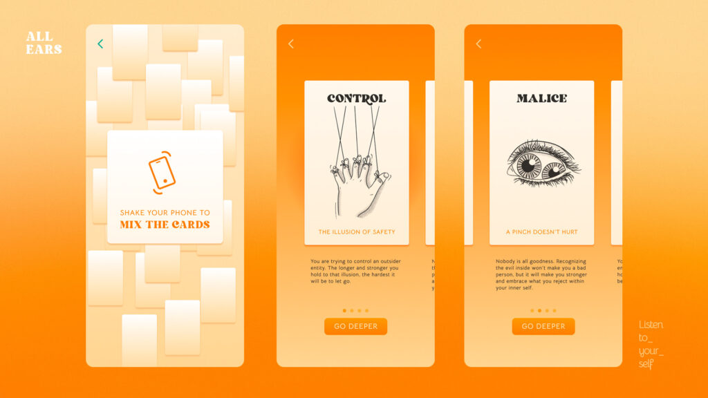 This research showed us users liked the game, but the were sometimes frustrated and needed help from the chaman to interpret the messages of the cards. Here is when the app turned out to be more than a place to talk with yourself, but also a channel to connect with NPL healers that can help you unlock messages.